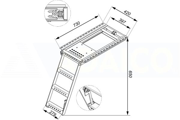 • Hinged folding ladder for machines and wagons. Three steps and a level. Grippy perforated stepping surfaces.